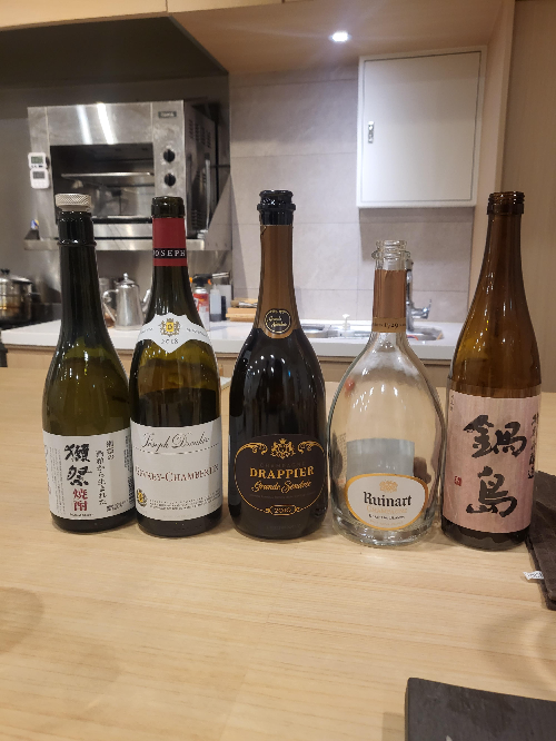 첫 스타트로 블랑 드 블랑이 칠링되어 있지 않아 아상블랑쥬인 드라피에 그랑드 상드레 밀레짐부터 마셨다. 푹 익은 사과의 꿀과 청사과, 아몬드, 이스트 그리고 아카시아 향이 올라온다. 산도는 마시기 시기 적절한 때였으나 이 와인은 차완무시와 같이 먹기엔 와인이 더 튀었다.